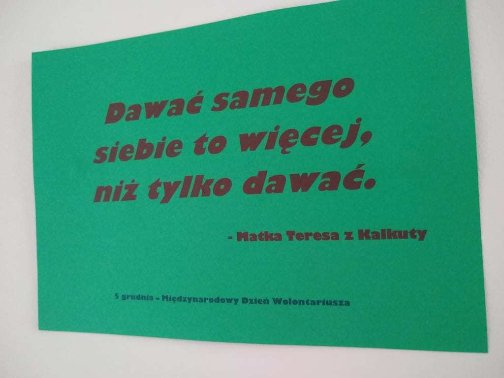 – Dzień Wolontariusza – z dziećmi przeprowadzone zostały pogadanki edukacyjne na temat wolontariuszy, mające na celu uwrażliwić uczniów na potrzeby innych. Na terenie całej szkoły powieszono kartki zachęcające do pomagania i podejmowania inicjatyw społecznych;