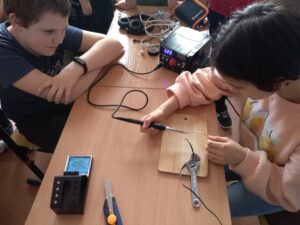 Uczniowie klasy VIa, podczas lekcji techniki, uczyli się lutować. Ich zadaniem było złączenie (poprzez lutowanie) przewodów elektrycznych i stworzenie mini instalacji LED. Jak widać na załączonych fotografiach, zadanie zostało wykonane prawidłowo, czego efektem było zaświecenie się światełek LED po włożeniu wtyczki do gniazdka.