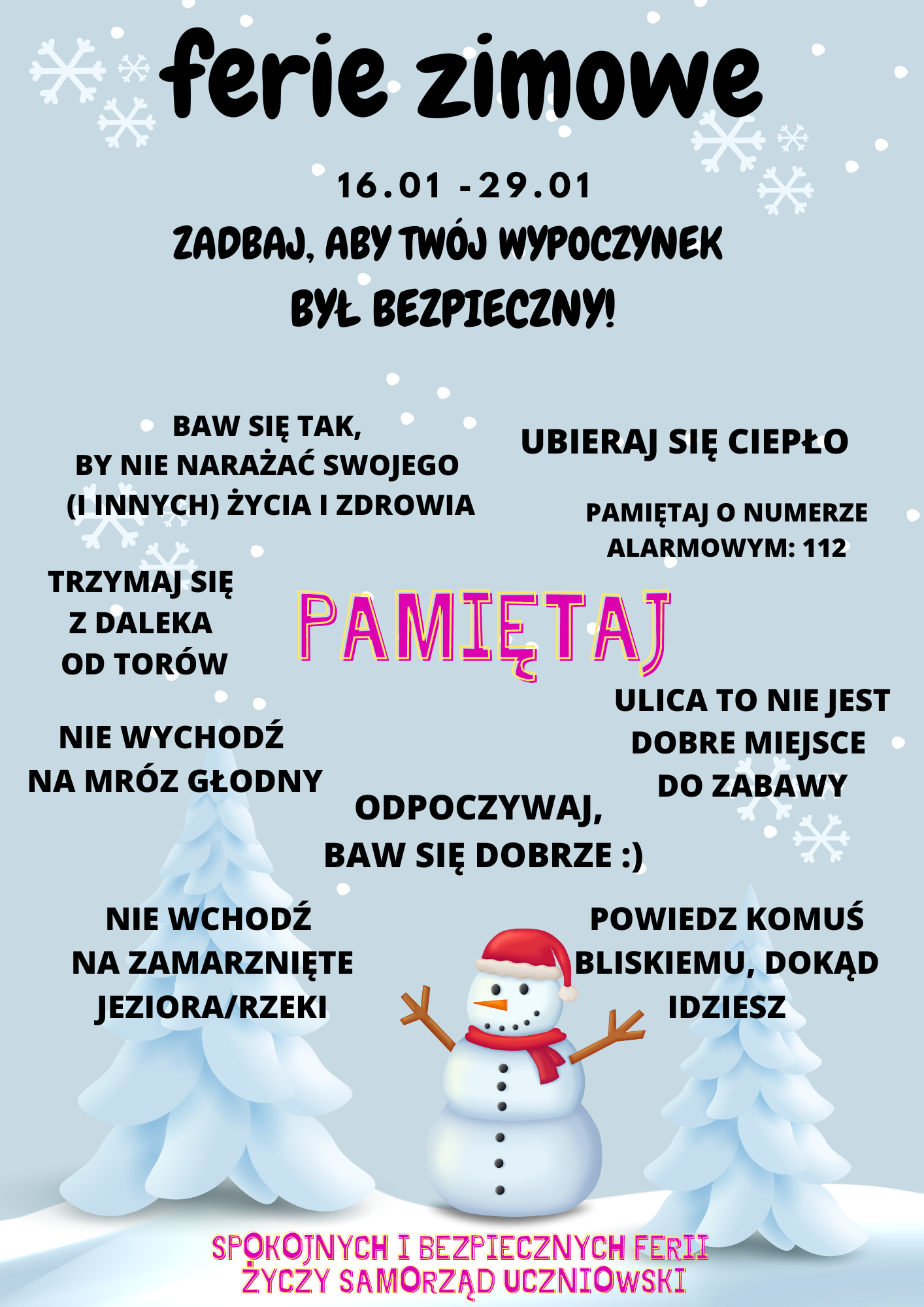Nareszcie! Nadeszły upragnione ferie zimowe. Odpoczywajcie, bawcie się dobrze! Róbcie to, na co zazwyczaj brakuje Wam czasu. ODETCHNIJCIE OD SZKOŁY. Samorząd Uczniowski przypomina o bezpieczeństwie! Spotkajmy się po feriach cali i zdrowi.