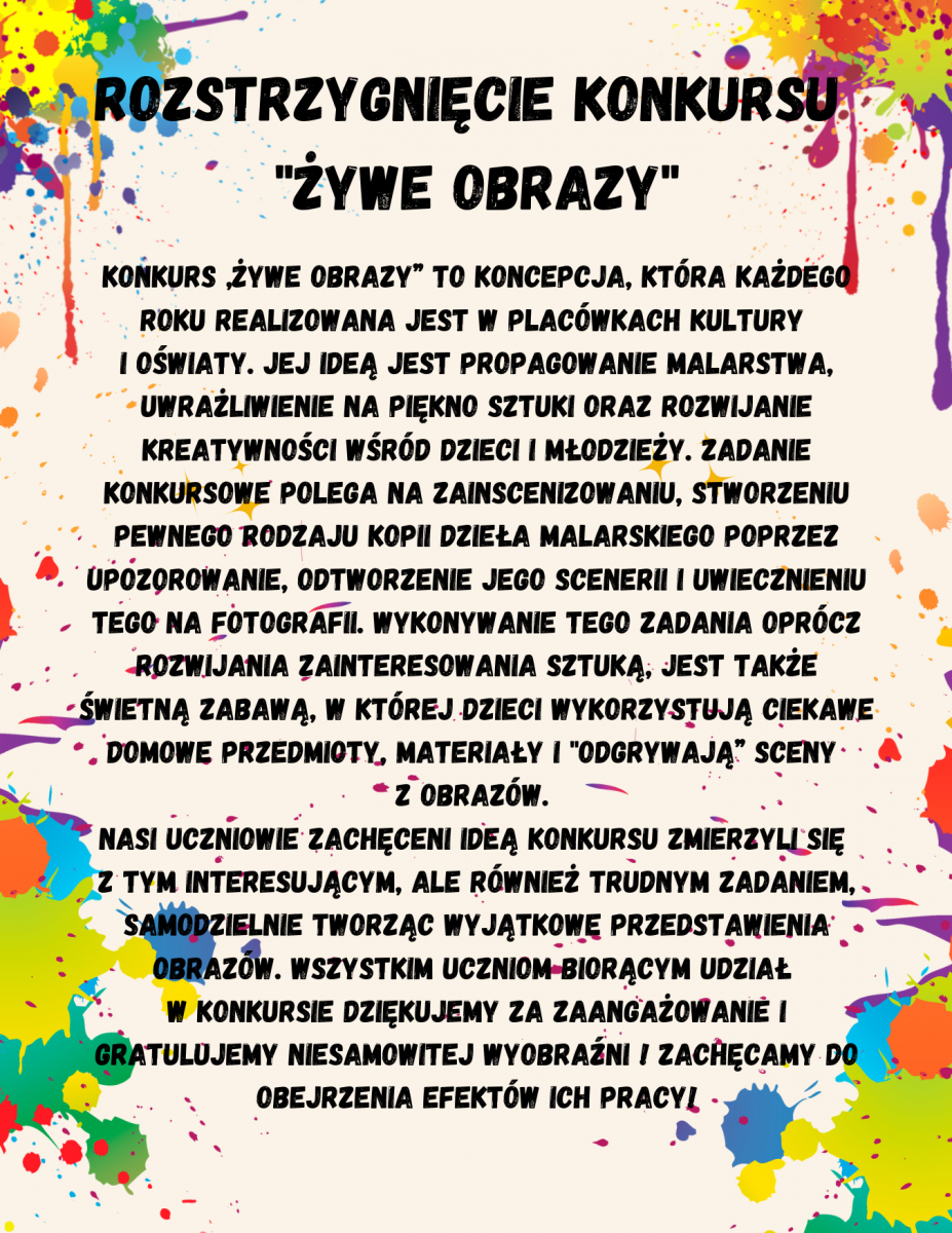 15 kwietnia obchodziliśmy Światowy Dzień Sztuki. A nasi uczniowie ze sztuką są za pan brat – ba! nawet sami tę sztukę tworzą! Zachęcamy do zapoznania się z wynikami i efektami szkolnego konkursu “Żywe obrazy”.