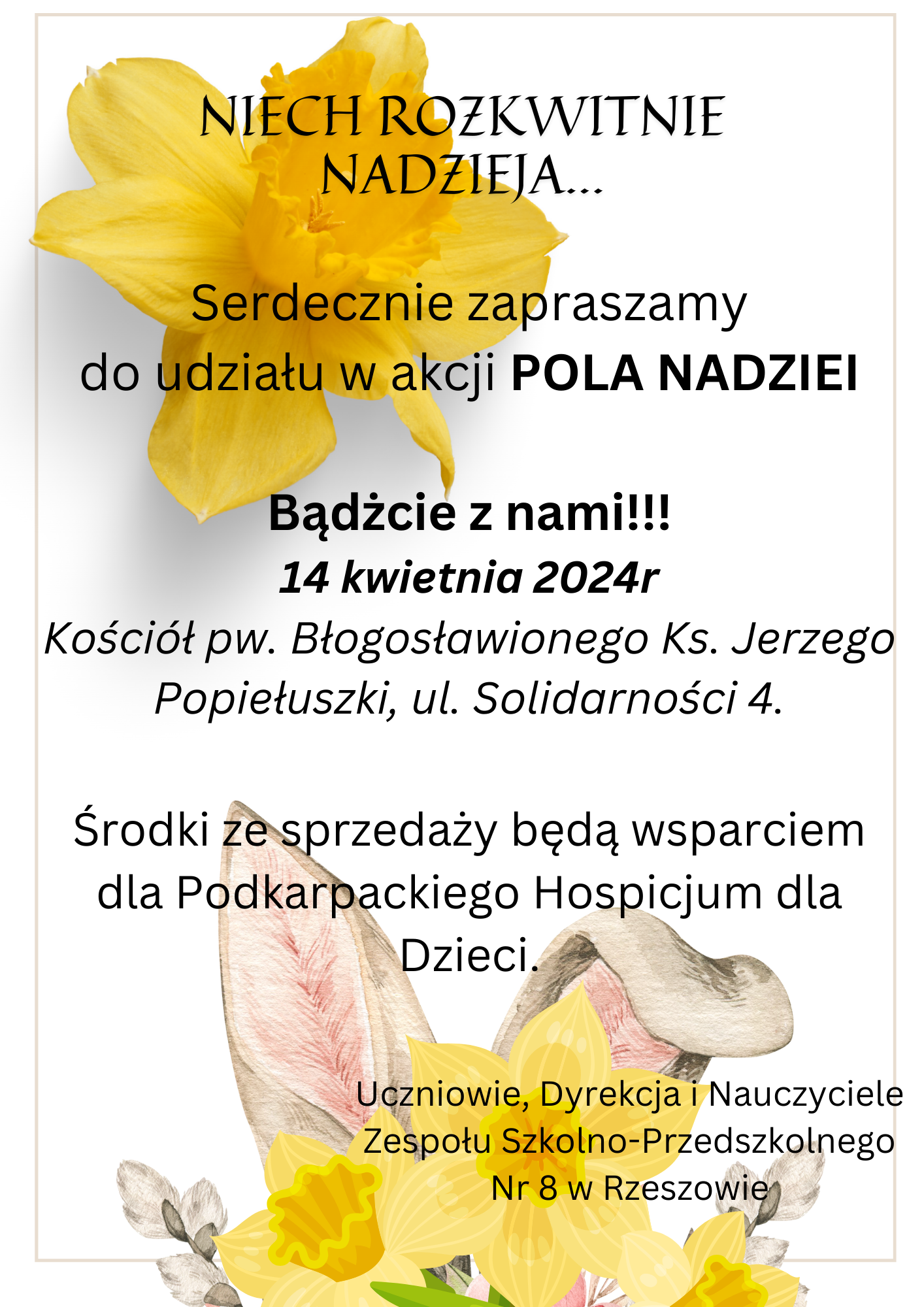 Uczniowie naszej szkoły, już nie tylko na terenie placówki, ale również przy Kościele parafialnym pw. Błogosławionego Ks. Jerzego Popiełuszki, prowadzić będą kwestę na rzecz Dzieciaków z Podkarpackiego Hospicjum dla Dzieci.