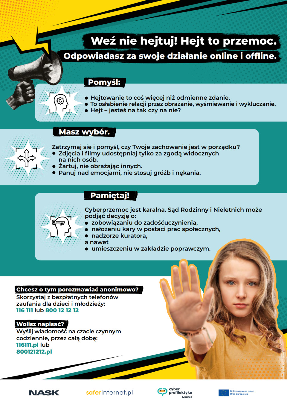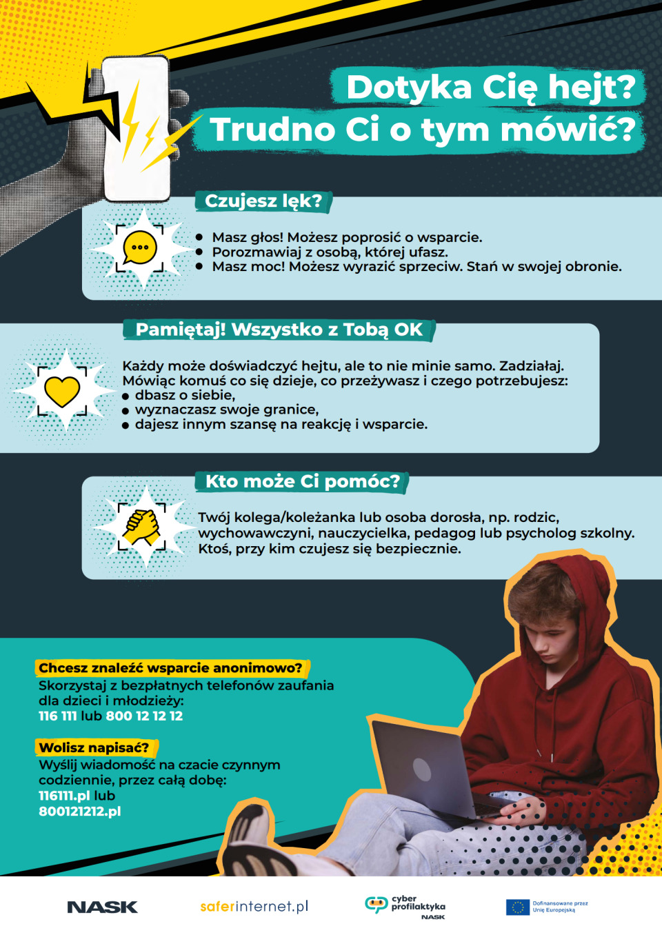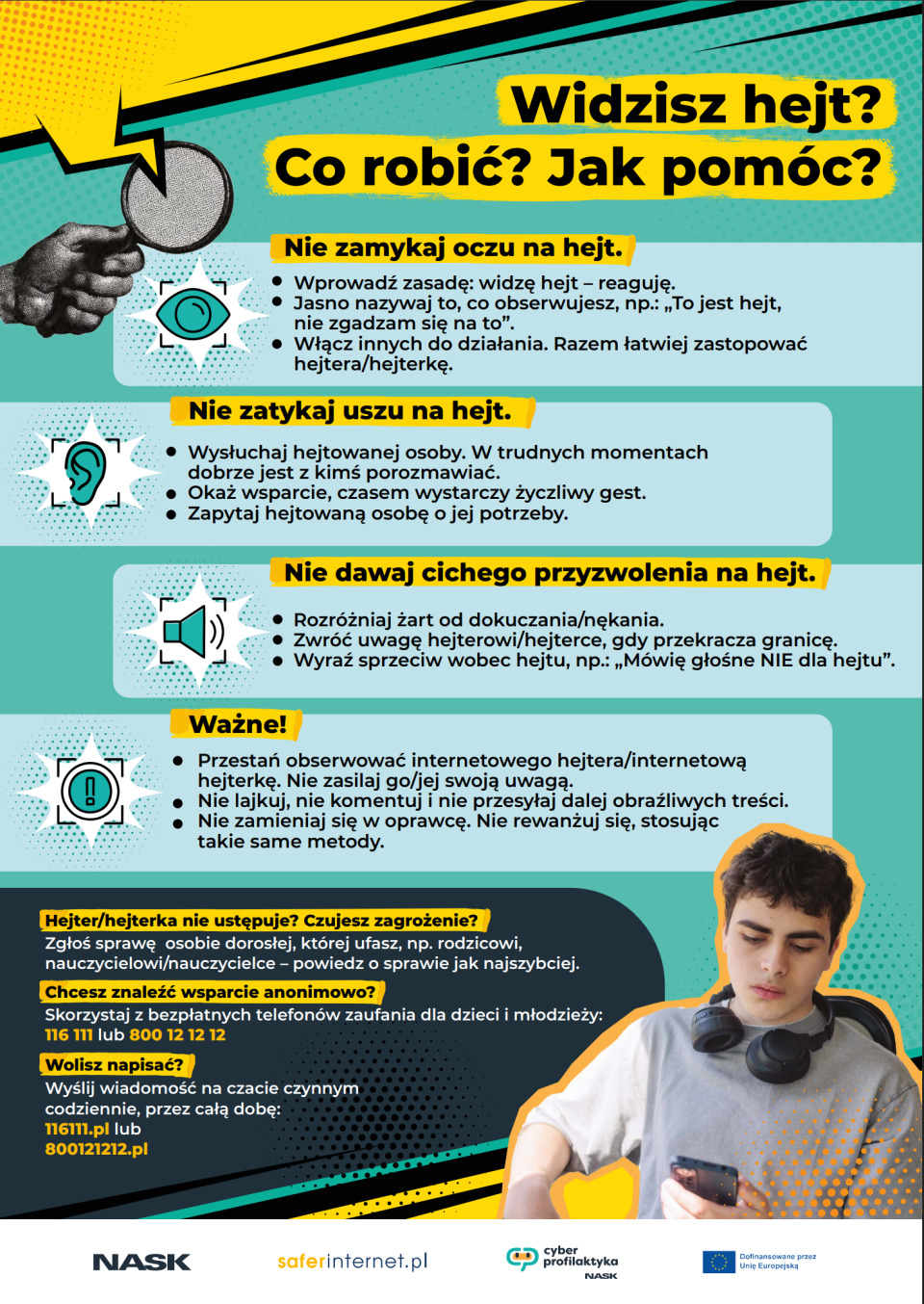 Zachęcamy do zapoznania się z zamieszczonymi poniżej plakatami edukacyjnymi dotyczącymi zjawiska hejtu. Ich treść merytoryczną opracowała psycholog i psychoterapeutka, ekspertka ds. profilaktyki cyberzagrożeń.