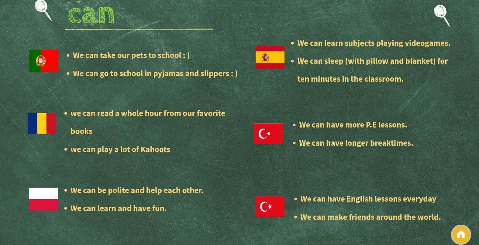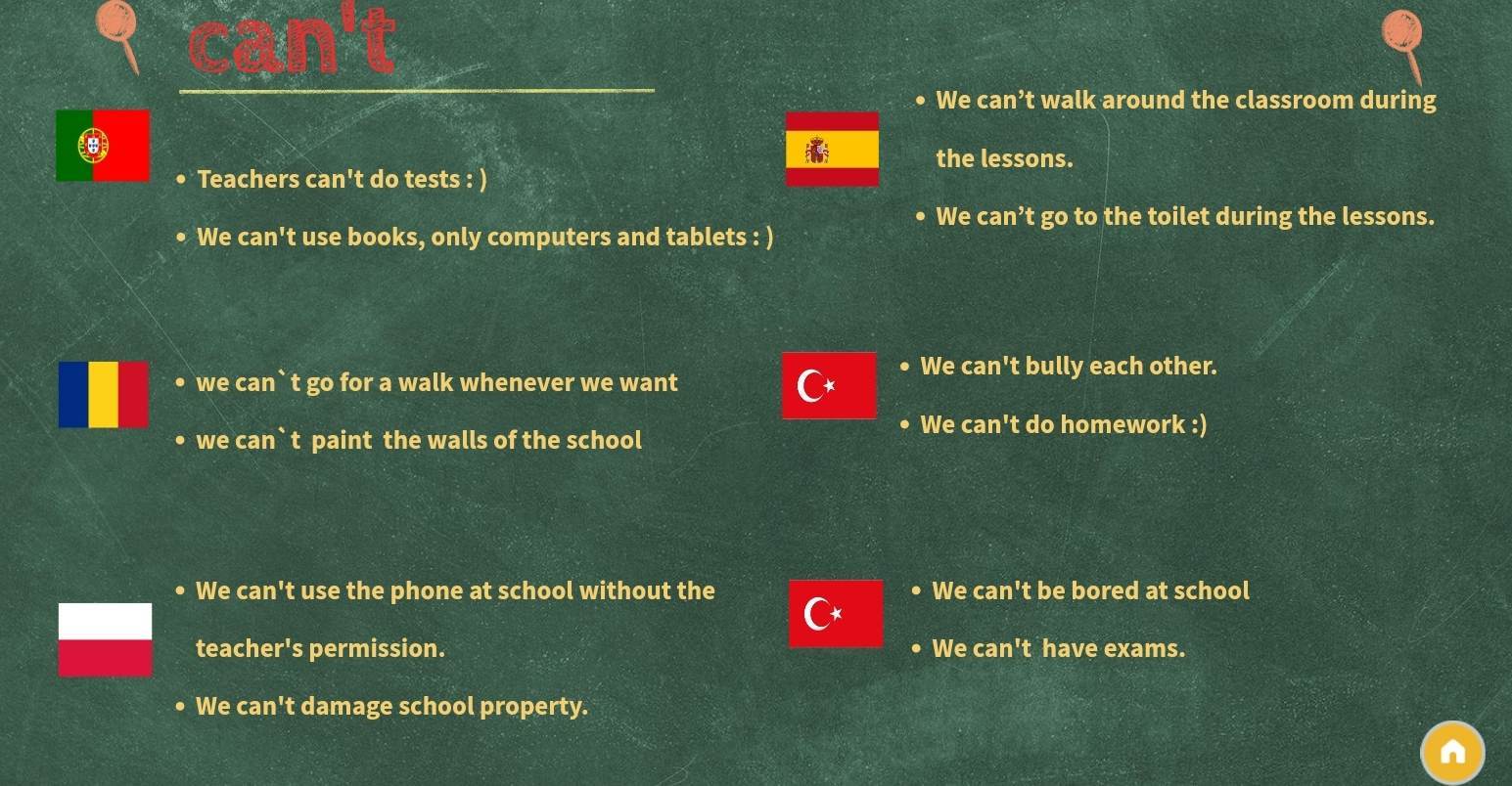 Dziś możemy się pochwalić hymnem naszej wirtualnej szkoły eTwinning. Zgodnie z regulaminem projektu w miesiącu marcu losowaliśmy salę, którą należało zaprojektować. Polska wylosowala salę gimnastyczną. Portugalia- plac zabaw, Turcja (Antalya) – bibliotekę, Rumunia- salę edukacyjną, Turcja (Istanbul) – stołówkę, a Hiszpania- salę komputerową. Następnie każde Państwo układało po osiem zwrotek do naszego hymnu. Przez długie tygodnie wspólnie z uczniami układaliśmy zwrotki do piosenki, rysowaliśmy salę gimnastyczną i wymyślaliśmy cztery zasady: dwie z nich – co możemy ( We can) i dwie – czego nam nie wolno ( We can’t). Oto efekt naszej pracy ![]()