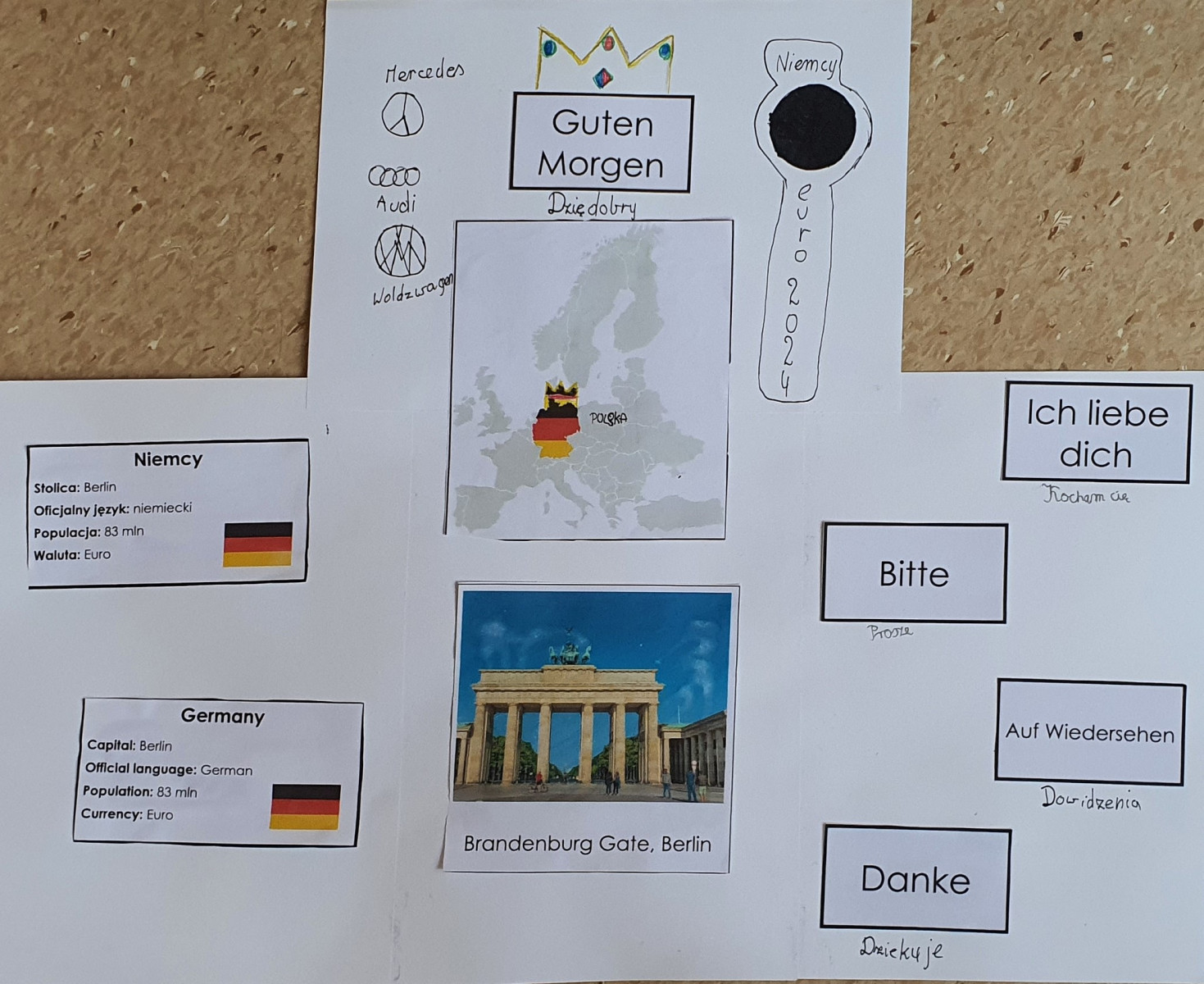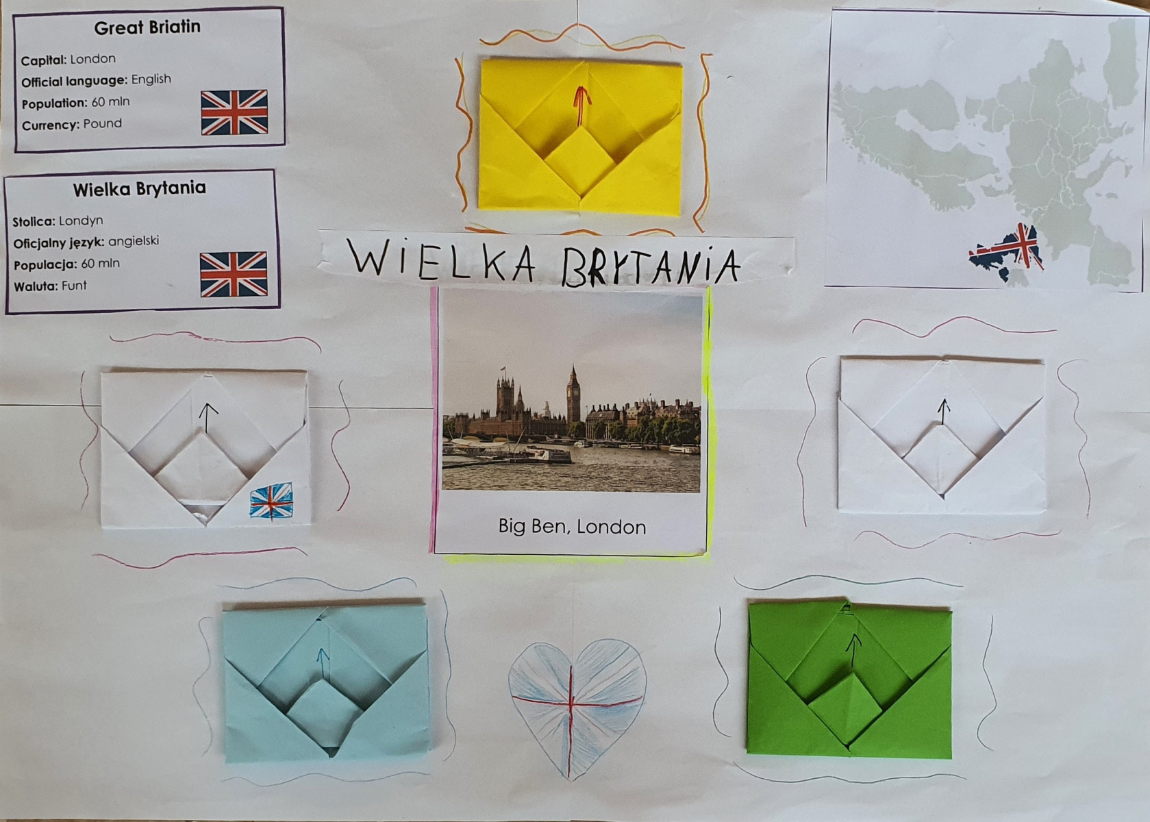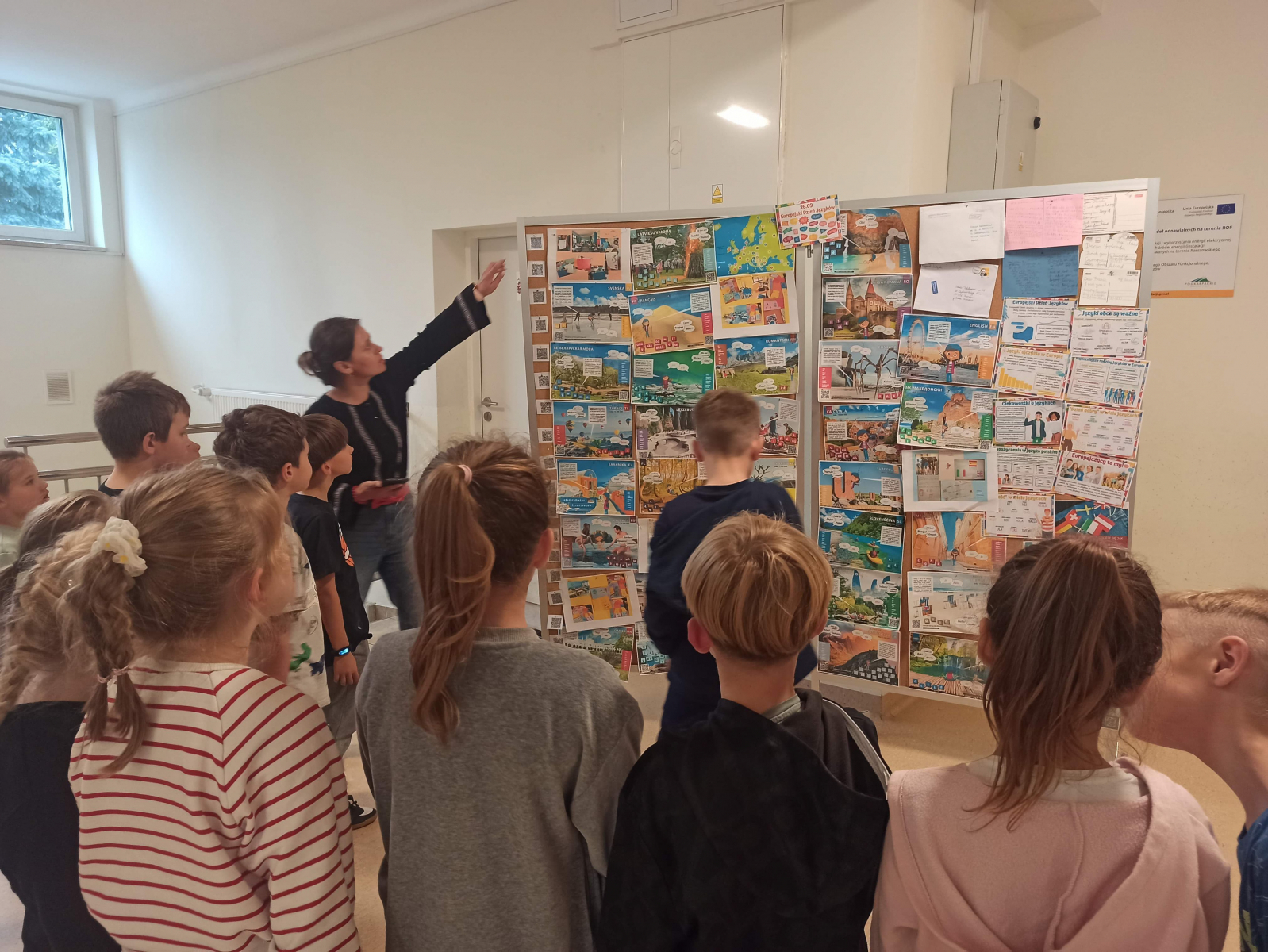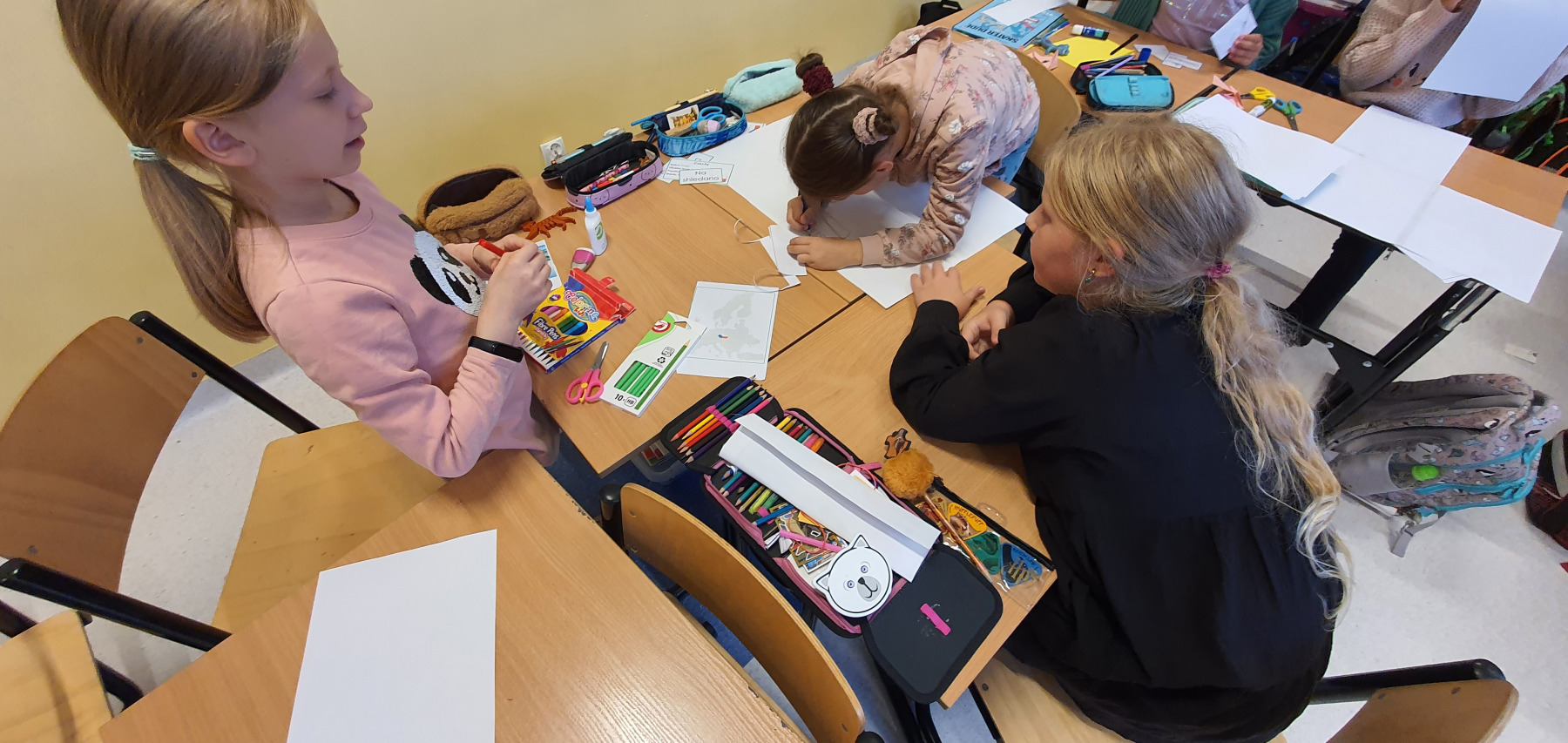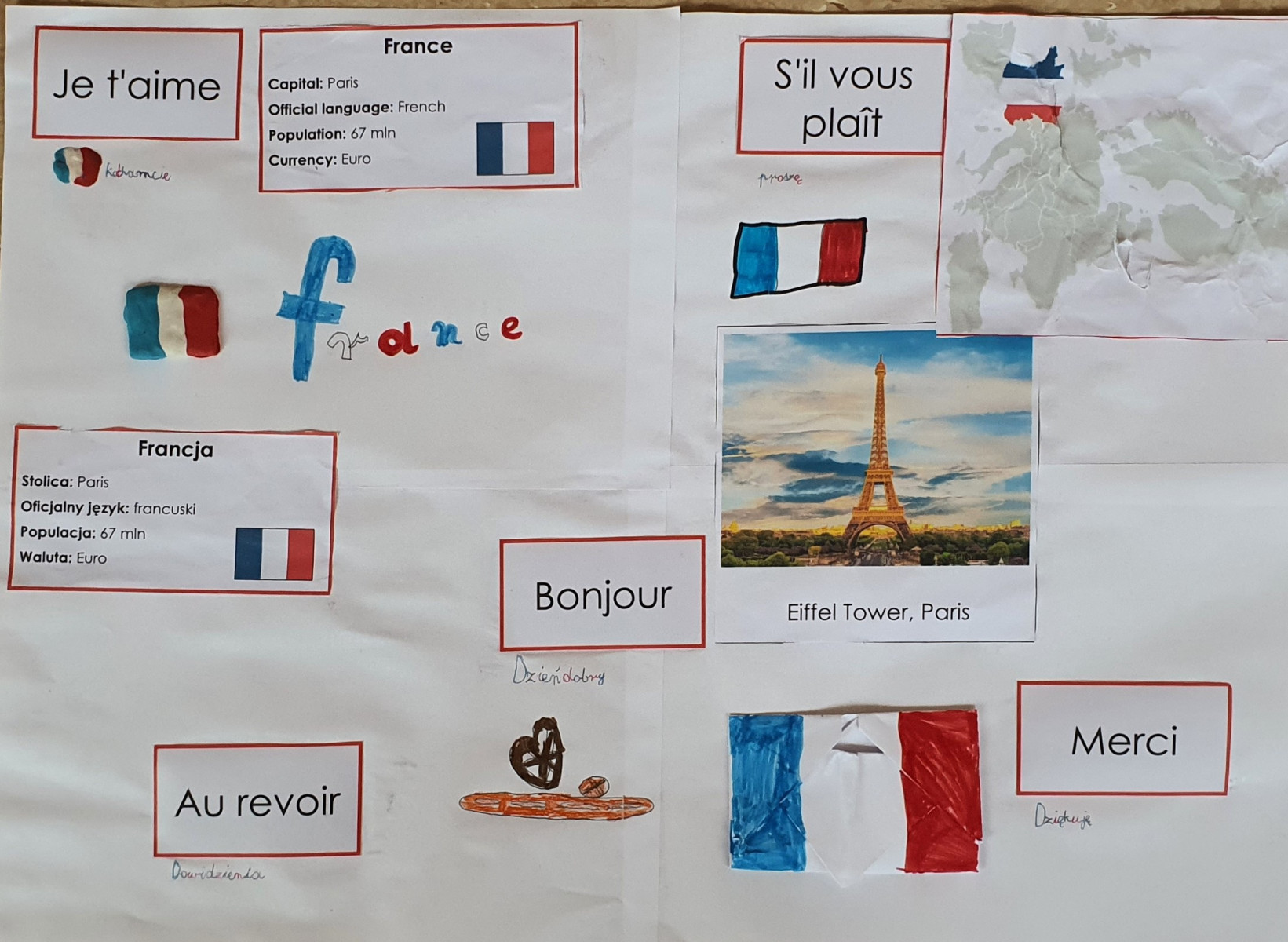 Wysłuchała pozdrowień przesłanych przez rówieśników z Francji. Uczniowie wykonali plakaty na których widnieją państwa na mapie Europy wraz z ich flagami. Możemy również odczytać krótką informację o powierzchni, populacji, walucie, języku państwowym, stolicy.