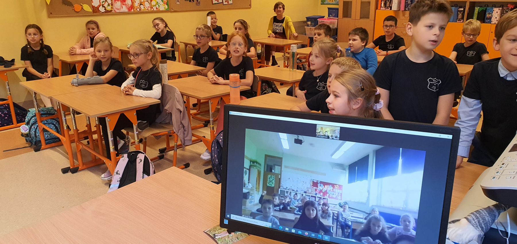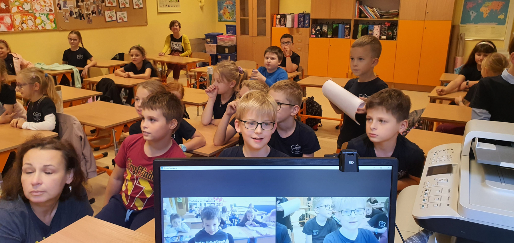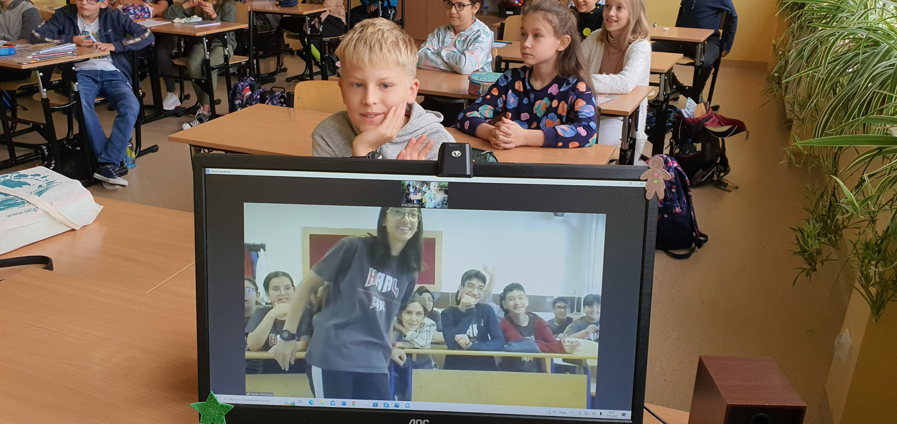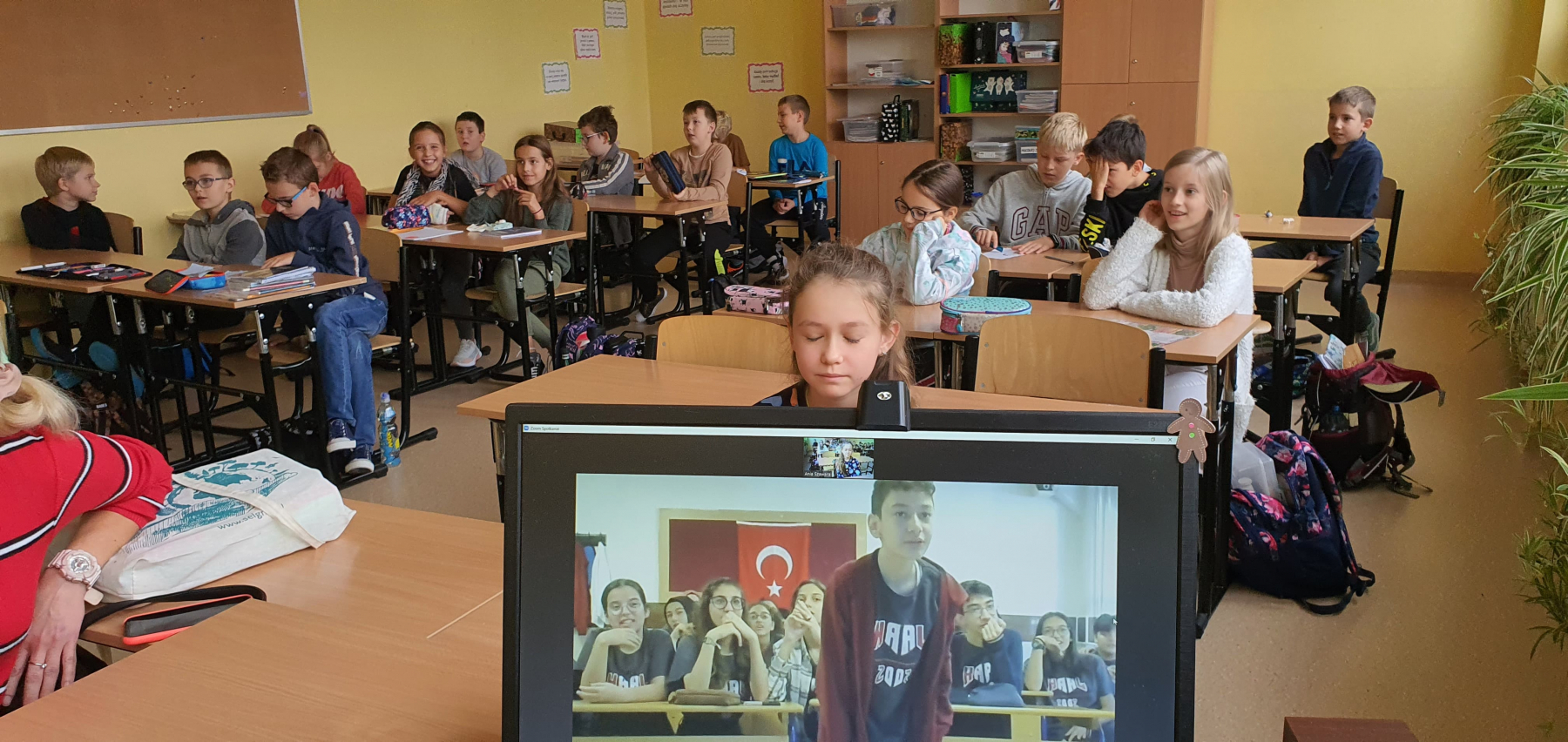 Klasa 4b również miała możliwość połączenia się online z uczniami z Turcji (Osmania). Była to ciekawa lekcja, ponieważ uczniowie dowiedzieli się ciekawostkach z Osmanii. Rozmawiali w języku angielskim. Zadawali pytania uczniowi z Turcji i odpowiadali na pytania. Konwersacja w języku angielskim w wieku 10 lat? Proszę mi wierzyć było na wysokim poziomie .