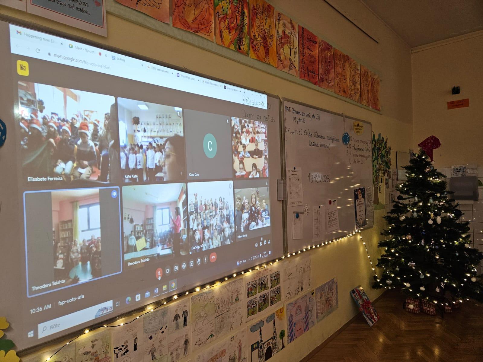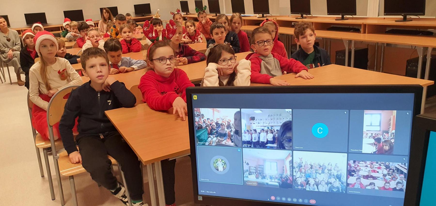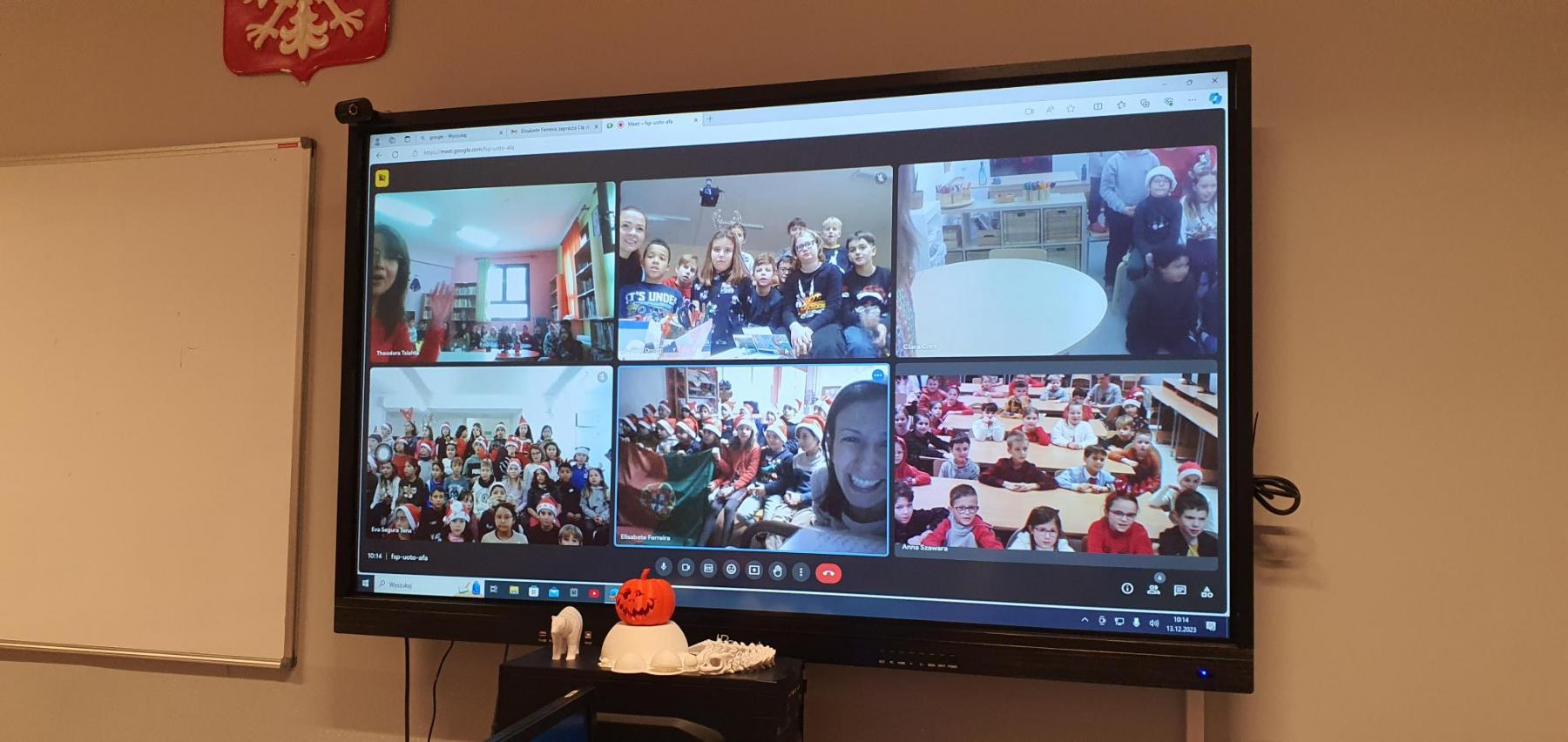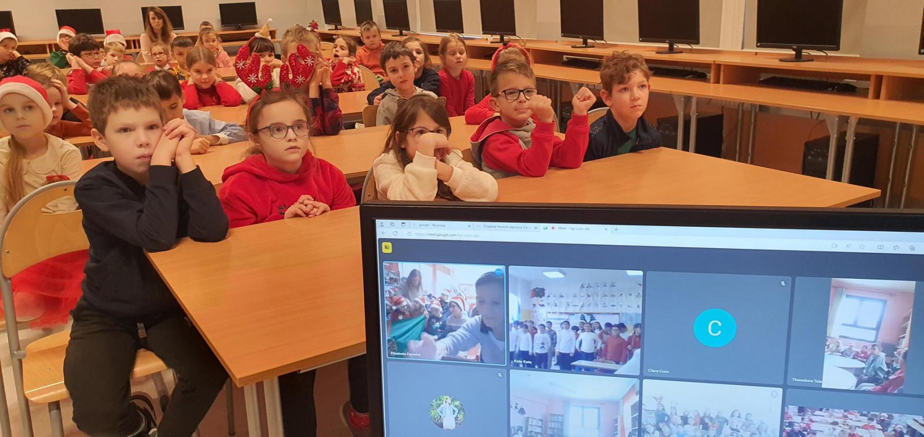 Klasy drugie również uczestniczyły w spotkaniu online. Tym razem na spotkaniu byli uczniowie z Portugalii, Grecji, Włoch, Słowenii, Hiszpanii i oczywiście My. Przypomnijmy sobie tylko o tym, że w listopadzie każdy drugoklasista ozdobił kartkę świąteczną dla dzieci z zagranicy i uczył się pisać życzenia świąteczne w języku angielskim. Wspólnie przygotowaliśmy 60 kartek i wysłaliśmy je do wszystkich państw partnerskich. Długie dwa tygodnie czekaliśmy na kartki zza granicy. Otrzymaliśmy je na początku grudnia i były to kolejne radosne dni, gdy czytaliśmy ich życzenia. Tutaj również musimy przyznać, że nie było to łatwe zadanie