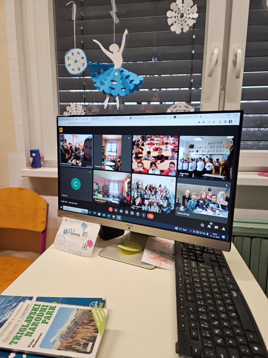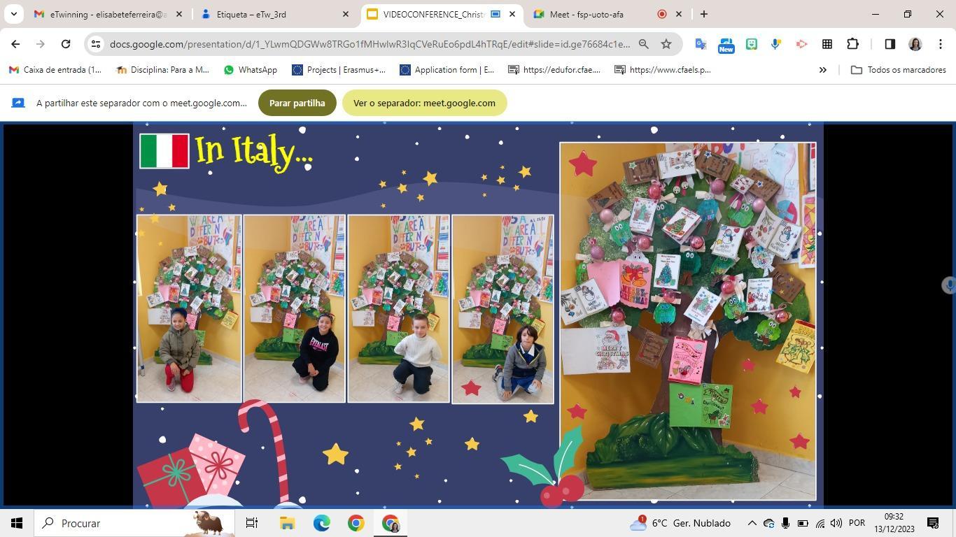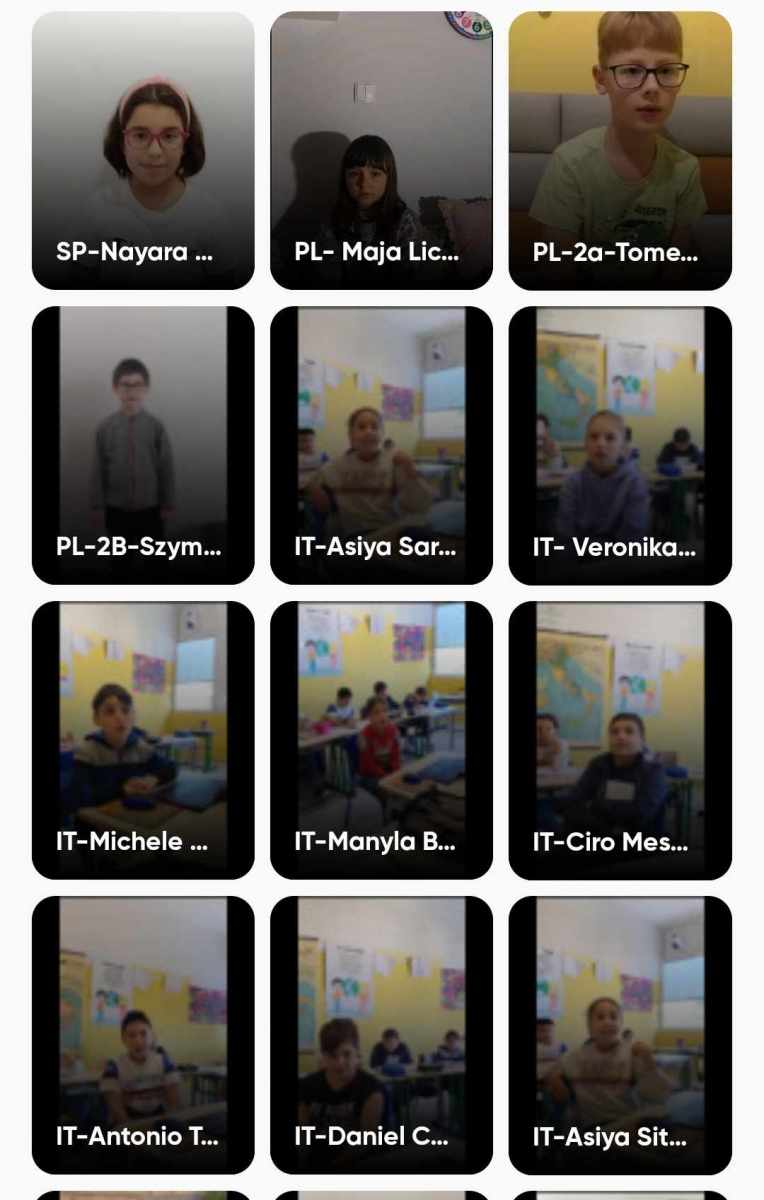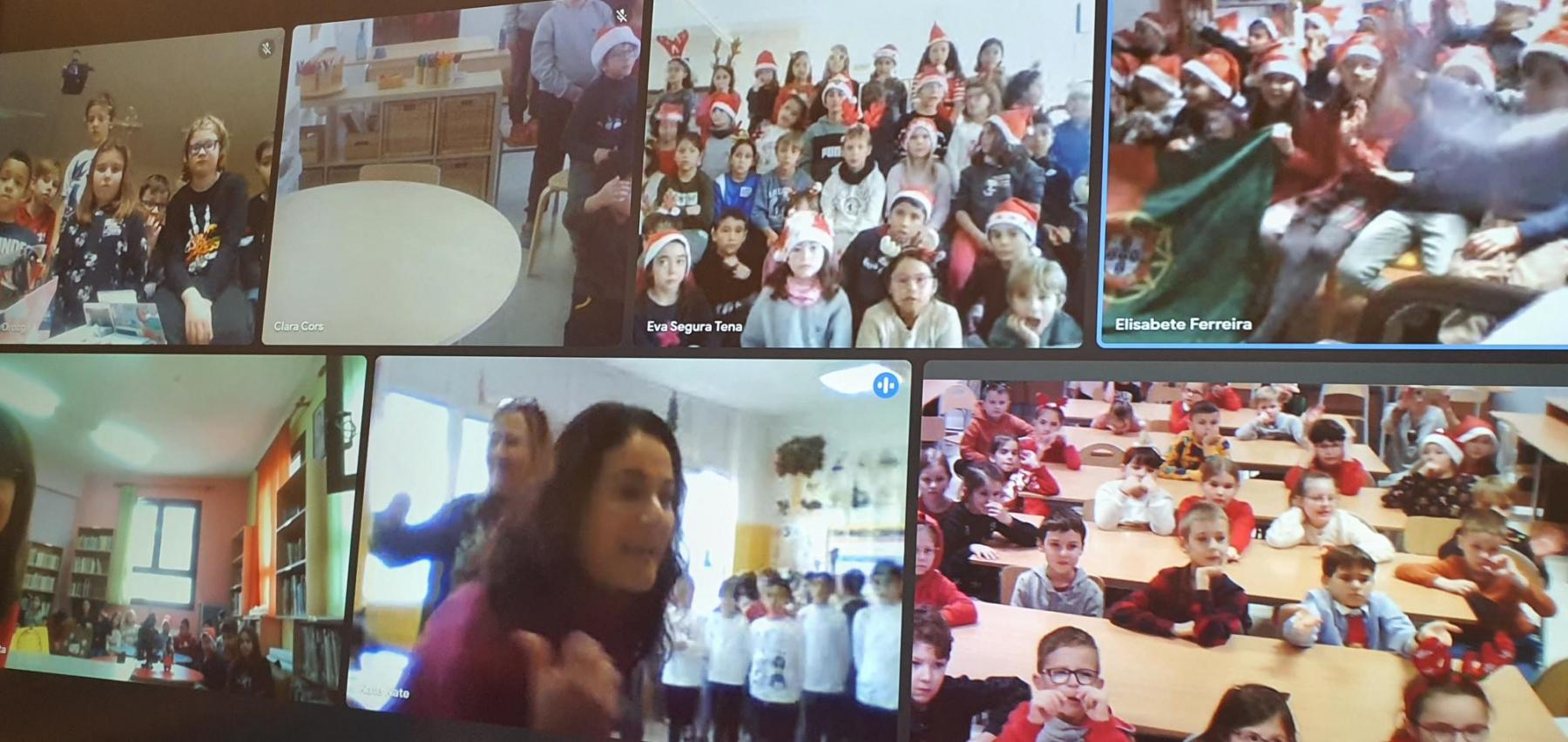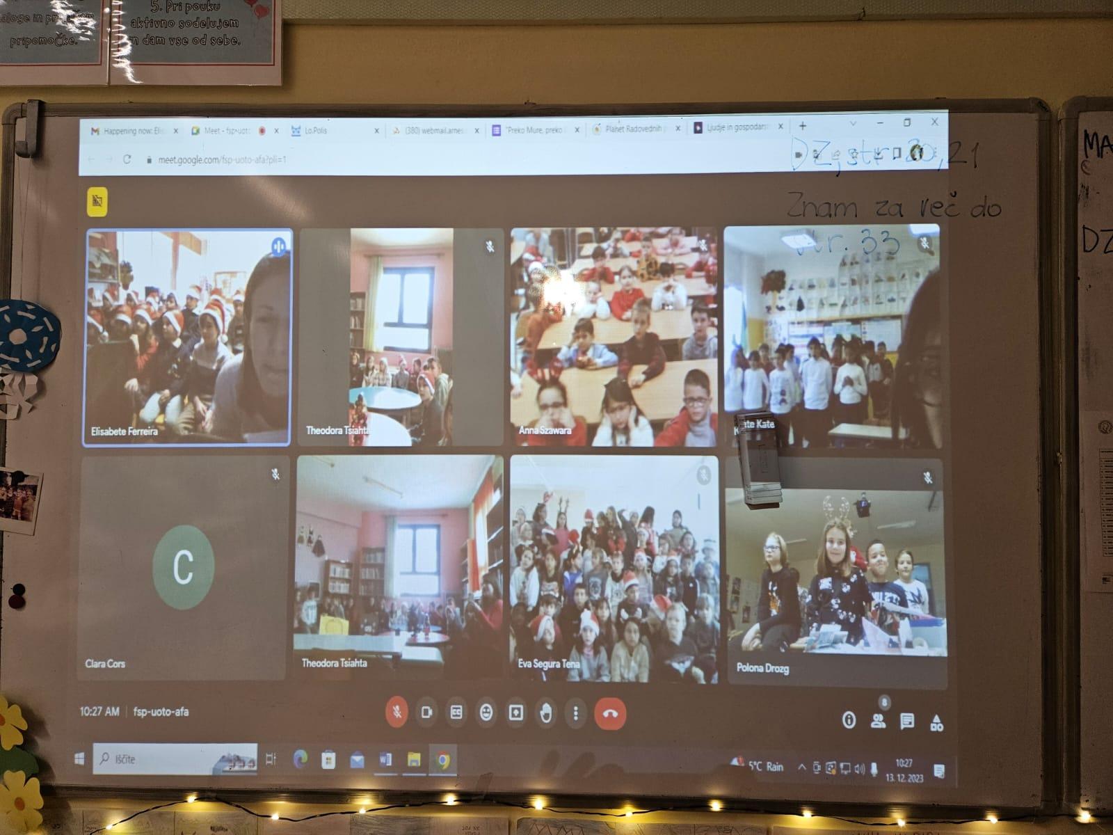Klasy drugie również uczestniczyły w spotkaniu online. Tym razem na spotkaniu byli uczniowie z Portugalii, Grecji, Włoch, Słowenii, Hiszpanii i oczywiście My. Przypomnijmy sobie tylko o tym, że w listopadzie każdy drugoklasista ozdobił kartkę świąteczną dla dzieci z zagranicy i uczył się pisać życzenia świąteczne w języku angielskim. Wspólnie przygotowaliśmy 60 kartek i wysłaliśmy je do wszystkich państw partnerskich. Długie dwa tygodnie czekaliśmy na kartki zza granicy. Otrzymaliśmy je na początku grudnia i były to kolejne radosne dni, gdy czytaliśmy ich życzenia. Tutaj również musimy przyznać, że nie było to łatwe zadanie