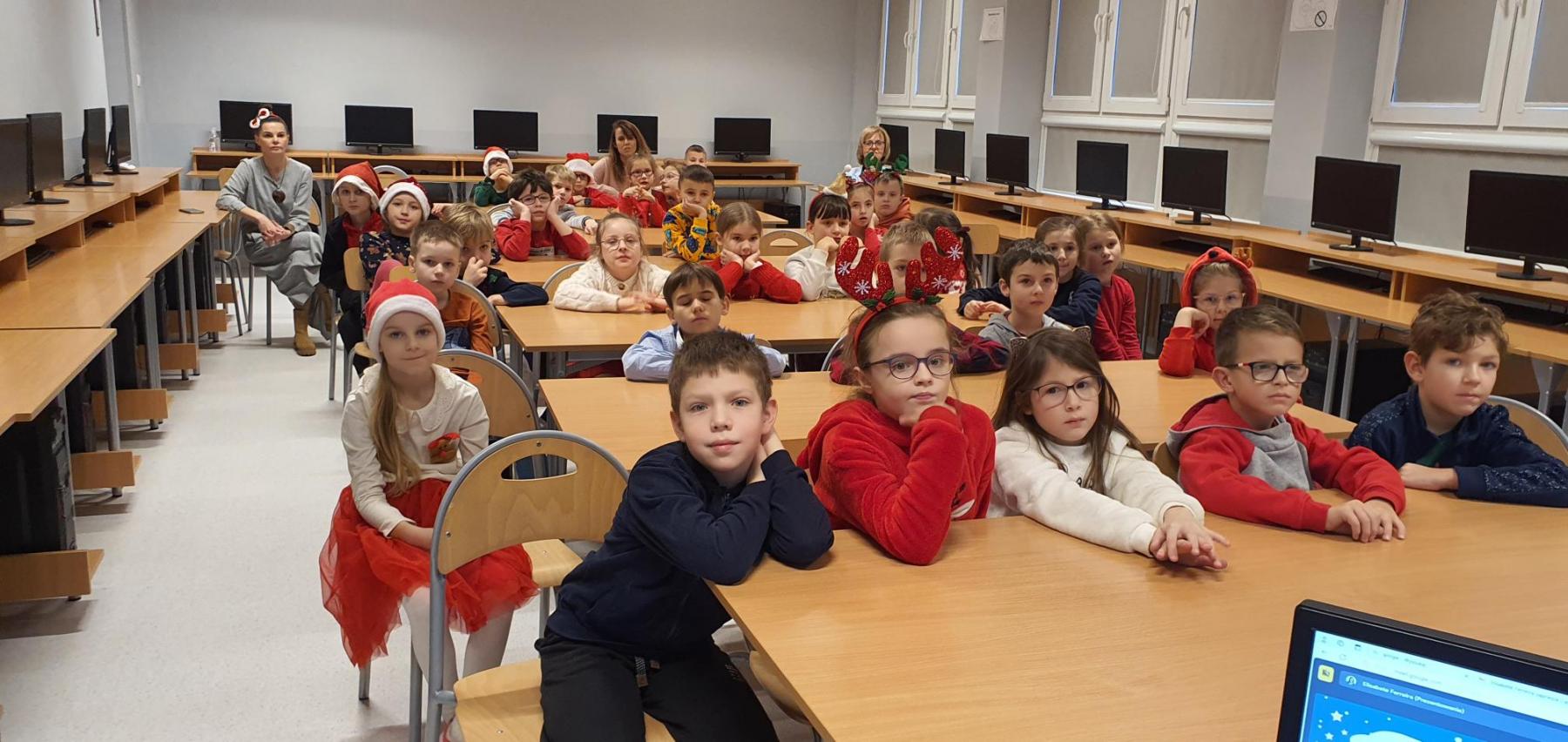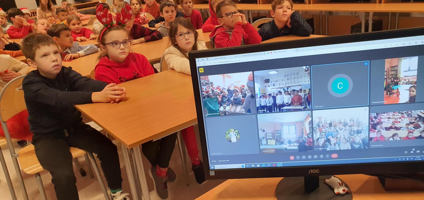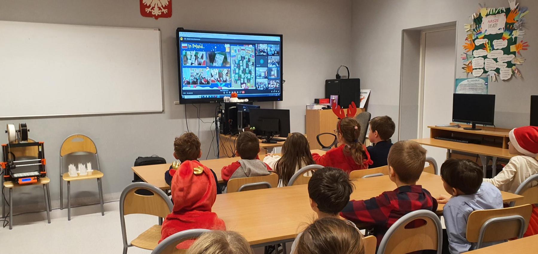 . Następnie utworzyliśmy drzewko bożonarodzeniowe z tych że kartek. 13 grudnia, podczas lekcji online mogliśmy zobaczyć i odszukać swoje kartki w różnych zakątkach Europy. Zobaczyliśmy jak wygląda klasa naszych rówieśników, poznaliśmy ich nauczycieli, a następnie mogliśmy posłuchać piosenek bożonarodzeniowych w języku angielskim. Sami przygotowaliśmy również piosenkę „What you want for Christmas” i zaśpiewaliśmy ją najlepiej jak potrafiliśmy. Ostatnie zadanie było najtrudniejsze, ponieważ mieliśmy powtórzyć „Wesołych świąt” w pięciu językach. Czasem nasz język odmawiał posłuszeństwa