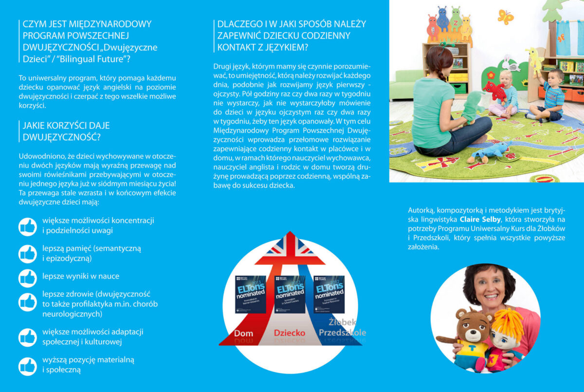 Nasza szkoła od września współpracuje z Międzynarodowym Programem Powszechnej Dwujęzyczności „Dwujęzyczne Dzieci- Bilingual Future ’’ założonym przez lingwistkę oraz autorkę specjalistycznych programów do nauki języka angielskiego Claire Selby.